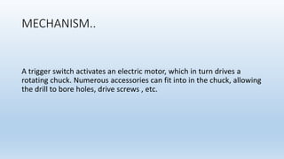 This document describes an electric-pneumatic bone drill. It has a trigger switch that activates an electric motor, which drives a rotating chuck that can hold various accessories for boring holes or driving screws. A bone drill is used in surgery to create holes in bones for inserting nails, screws, or other implants. It works using both electric power and a handpiece operated via foot switch. Advantages include adjustable handpiece speeds and a lighter, shorter handpiece that remains cool. Disadvantages can include accidentally drilling too deep and heat buildup. Safety precautions when using it include wearing protective eyewear and lubricating to prevent overheating.