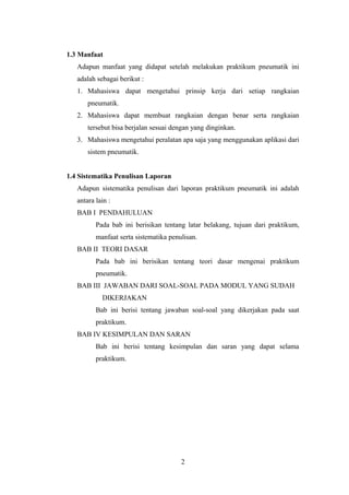 Dokumen ini membahas praktikum pneumatik yang wajib diikuti oleh mahasiswa teknik mesin untuk memahami sistem pneumatik dan aplikasinya di industri. Tujuan praktikum ini termasuk pemahaman fungsi katup, peralatan, dan prinsip kerja rangkaian pneumatik. Selain itu, laporan ini juga mencakup teori dasar mengenai komponen dan susunan sistem pneumatik.