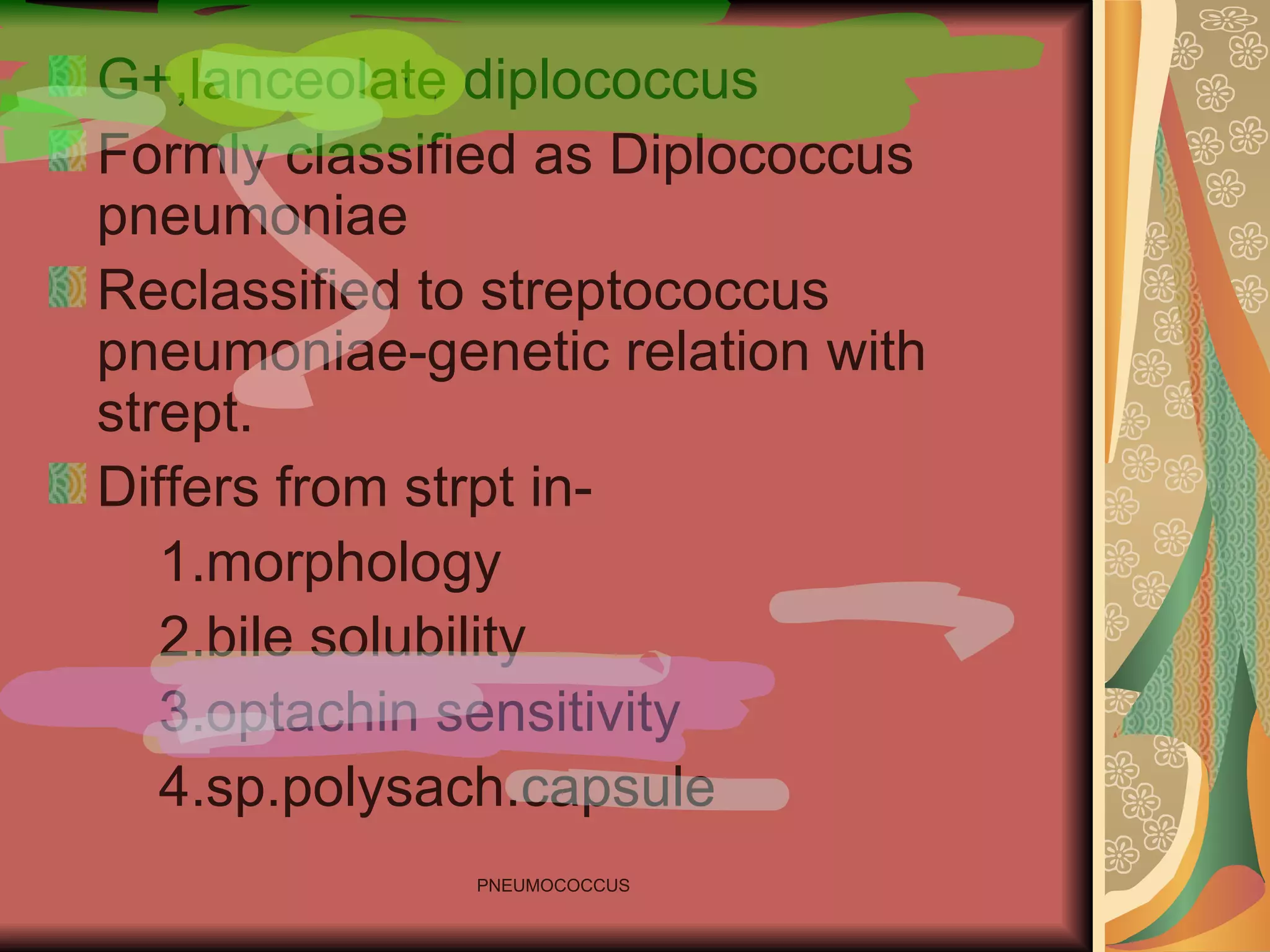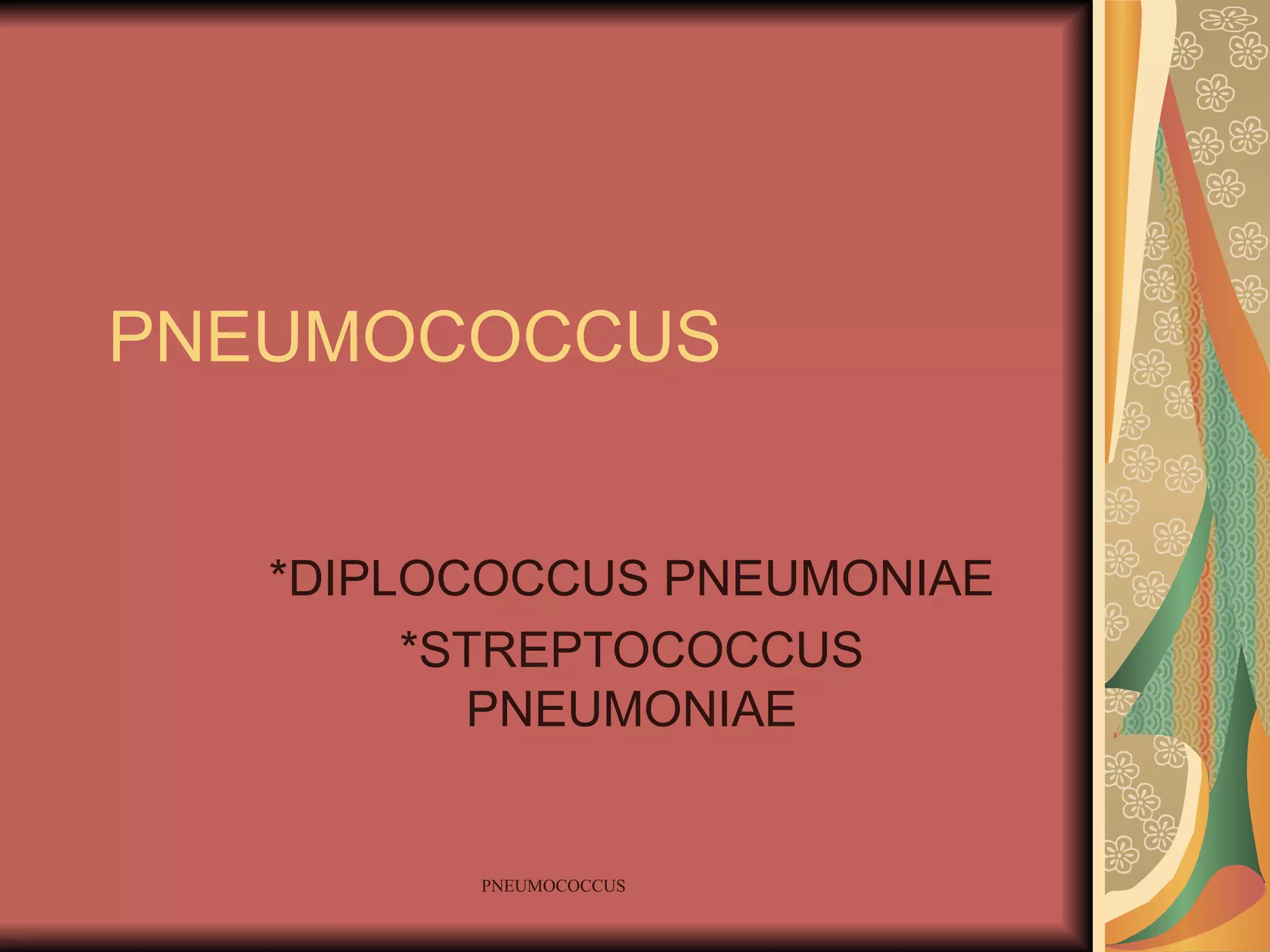 Pneumococcus, also known as Streptococcus pneumoniae, is a Gram-positive bacterium that is a major cause of pneumonia as well as other infections like otitis media, sinusitis, and meningitis. It forms lance-shaped diplococci and is encapsulated, with over 90 known capsular serotypes that determine its antigenic properties and virulence. The capsule allows it to evade phagocytosis by immune cells. Pneumococcal disease is generally acquired through inhalation from respiratory carriers and occurs when host defenses are compromised.