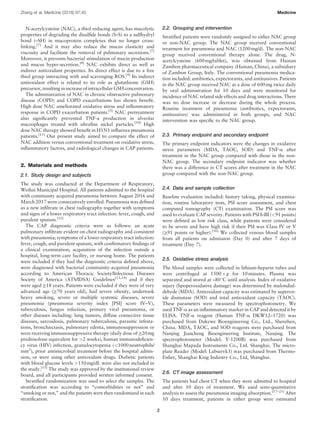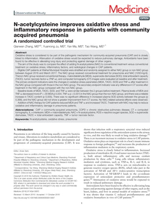 This randomized controlled trial investigated the effects of adding N-acetylcysteine (NAC) therapy to conventional treatment for community-acquired pneumonia (CAP) patients. Patients were randomly assigned to receive either conventional treatment alone or conventional treatment plus NAC. The primary outcomes measured were changes in oxidative stress and inflammatory markers, and the secondary outcome was changes in CT scan scores. The results showed that plasma levels of the oxidative stress marker MDA and the inflammatory marker TNF-α decreased more in the NAC group compared to the conventional treatment group. Additionally, total antioxidant capacity increased more in the NAC group. However, there was no significant difference in changes to CT scan scores or levels of the antioxidant SOD between the two groups