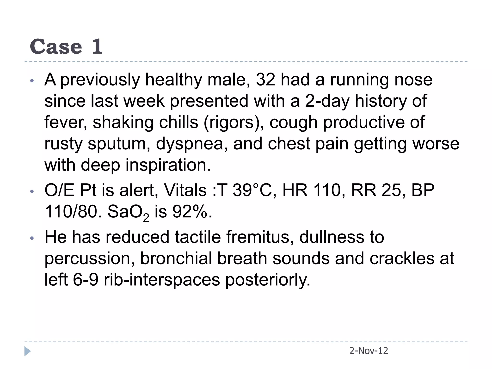 A previously healthy 32-year-old male presented with a 2-day history of fever, chills, productive cough, dyspnea, and chest pain. On examination, he had tachycardia, tachypnea, and reduced breath sounds with crackles on the left side of his chest. He likely has pneumonia based on his symptoms and physical exam findings of reduced breath sounds and crackles.