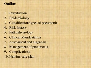 Pneumonia is an inflammation of the lungs that can be caused by bacteria, viruses, or fungi. It affects millions of people annually and can sometimes be fatal. The document discusses the epidemiology, classification, risk factors, pathophysiology, signs and symptoms, diagnosis, treatment, complications, and nursing care plan for pneumonia patients. Key points include the different types of pneumonia based on location (community-acquired vs. hospital-acquired), causative agents, and patient risk factors. Proper diagnosis involves tests of sputum or other samples, along with chest imaging. Treatment focuses on antibiotics, respiratory support, fluids, rest, and patient education.
