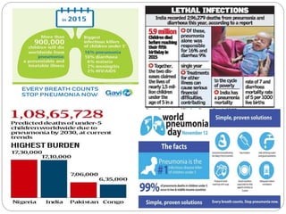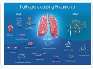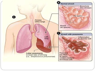 The document discusses pneumonia, defining it as an inflammatory process in the lung parenchyma that can lead to serious health issues, particularly in children under five years old, with high incidence rates in areas like South Asia and Africa. It covers various types, causes, risk factors, clinical manifestations, diagnostic evaluations, and management strategies for pneumonia. The document emphasizes the importance of medical and nursing management, patient education, and preventive measures to combat pneumonia effectively.