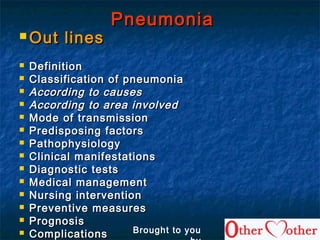 This document provides an overview of pneumonia, including its definition, classification, causes, transmission, risk factors, symptoms, diagnostic tests, treatment, nursing care, prevention, prognosis, and complications. Pneumonia is defined as an inflammatory condition of the lungs caused by infectious agents. It can be classified according to its causes such as bacterial, viral, fungal, or chemical, and the area of lung involvement. Common symptoms include fever, cough, chest pain, and shortness of breath. Diagnosis involves medical history, physical exam, chest x-ray, and sputum/blood tests. Treatment consists of antibiotics, oxygen therapy, and chest physiotherapy. Nursing care focuses on airway maintenance, infection control, respiratory support,