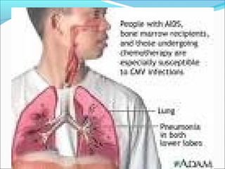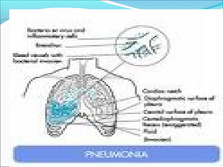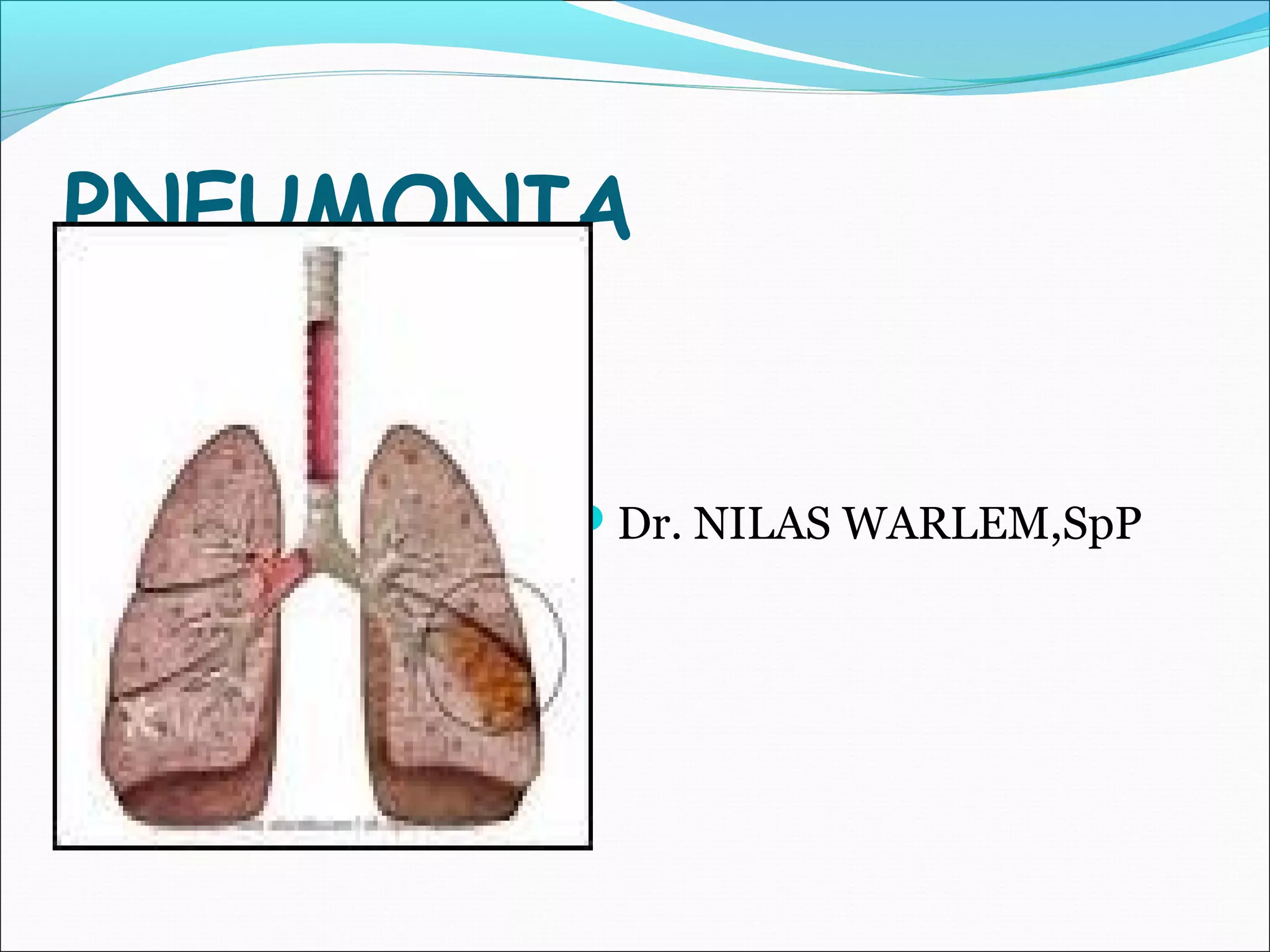 Pneumonia adalah infeksi paru yang disebabkan oleh berbagai mikroorganisme seperti bakteri, virus, jamur, dan protozoa. Gejala klinis umumnya meliputi demam, batuk, dan nyeri dada. Diagnosis didasarkan pada pemeriksaan fisik, hasil rontgen dada, dan riwayat pasien. Pneumonia dapat dibedakan menjadi komunitas dan nosokomial berdasarkan lokasi perolehan infeksinya.