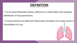 Pneumonia is an inflammation of the lungs that can have multiple causes. It is typically caused by bacterial, viral or fungal infections. Pneumonia can be classified based on location in the lungs, cause, or clinical setting. Common symptoms include cough, fever, chest pain and difficulty breathing. Diagnosis involves physical exam, chest x-ray, blood tests and sputum/fluid cultures. Treatment focuses on antibiotics, oxygen therapy and treatment of complications. Hospital-acquired pneumonia requires broader-spectrum antibiotics due to more drug-resistant organisms. Prevention emphasizes hand hygiene, limiting aspiration and prudent antibiotic use.