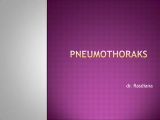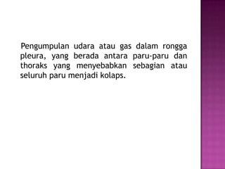 Pneumothorax adalah pengumpulan udara dalam rongga pleura yang dapat menyebabkan kolaps paru-paru, dengan berbagai klasifikasi berdasarkan penyebab, lokasi, derajat kolaps, dan jenis fistel. Gejala termasuk dyspnea, nyeri dada, dan perubahan pada pemeriksaan fisik dan radiologis. Penanganan meliputi observasi, dekompresi dengan torakosintesis, dan pengelolaan cepat untuk pneumothorax tension yang dapat membahayakan nyawa.
