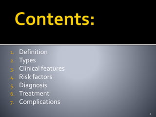 This document discusses pneumothorax, beginning with a definition and overview of types including spontaneous, traumatic, and tension pneumothorax. Risk factors are identified such as male sex, smoking, age, genetics, and lung disease. Diagnosis involves physical exam findings and imaging tests like chest x-ray and CT scan. Treatment goals are promoting lung expansion and eliminating causes, using methods such as aspiration, tube drainage, or surgery. Complications are also reviewed.