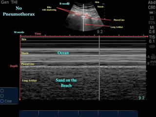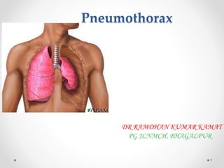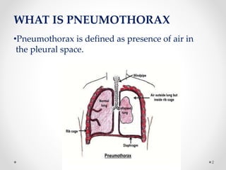 The document discusses pneumothorax, including its definition, pathophysiology, etiology, clinical manifestations, investigations, and management. Pneumothorax is defined as the presence of air in the pleural space. It can occur spontaneously due to ruptured blebs or bullae, or due to trauma. Clinical manifestations include dyspnea, chest pain, and decreased breath sounds on examination. Chest x-ray and CT scan are used to diagnose and characterize pneumothorax. Management involves oxygen therapy, needle aspiration, chest tube drainage, and chemical pleurodesis to promote lung re-expansion and prevent recurrence.