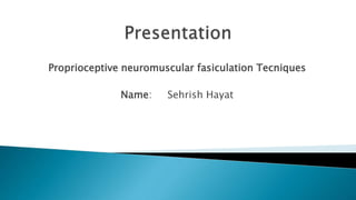 Proprioceptive neuromuscular facilitation (PNF) is a stretching technique developed in the 1940s to rehabilitate polio patients. It involves contracting and relaxing muscles while stretching to maximize flexibility. Common PNF techniques include hold-relax, contract-relax, and hold-relax-active contraction. The techniques use isometric contractions to trigger a reflex that allows deeper stretching. PNF can enhance strength, balance, mobility and treat neuromuscular deficits.