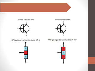 Dokumen tersebut menjelaskan transistor PNP sebagai jenis transistor bipolar dimana tegangan positif diterapkan pada emitor. Transistor PNP memiliki konfigurasi positif-negatif-positif dan arus mengalir dari emitor ke kolektor ketika tegangan emitor lebih positif dari basis dan kolektor.