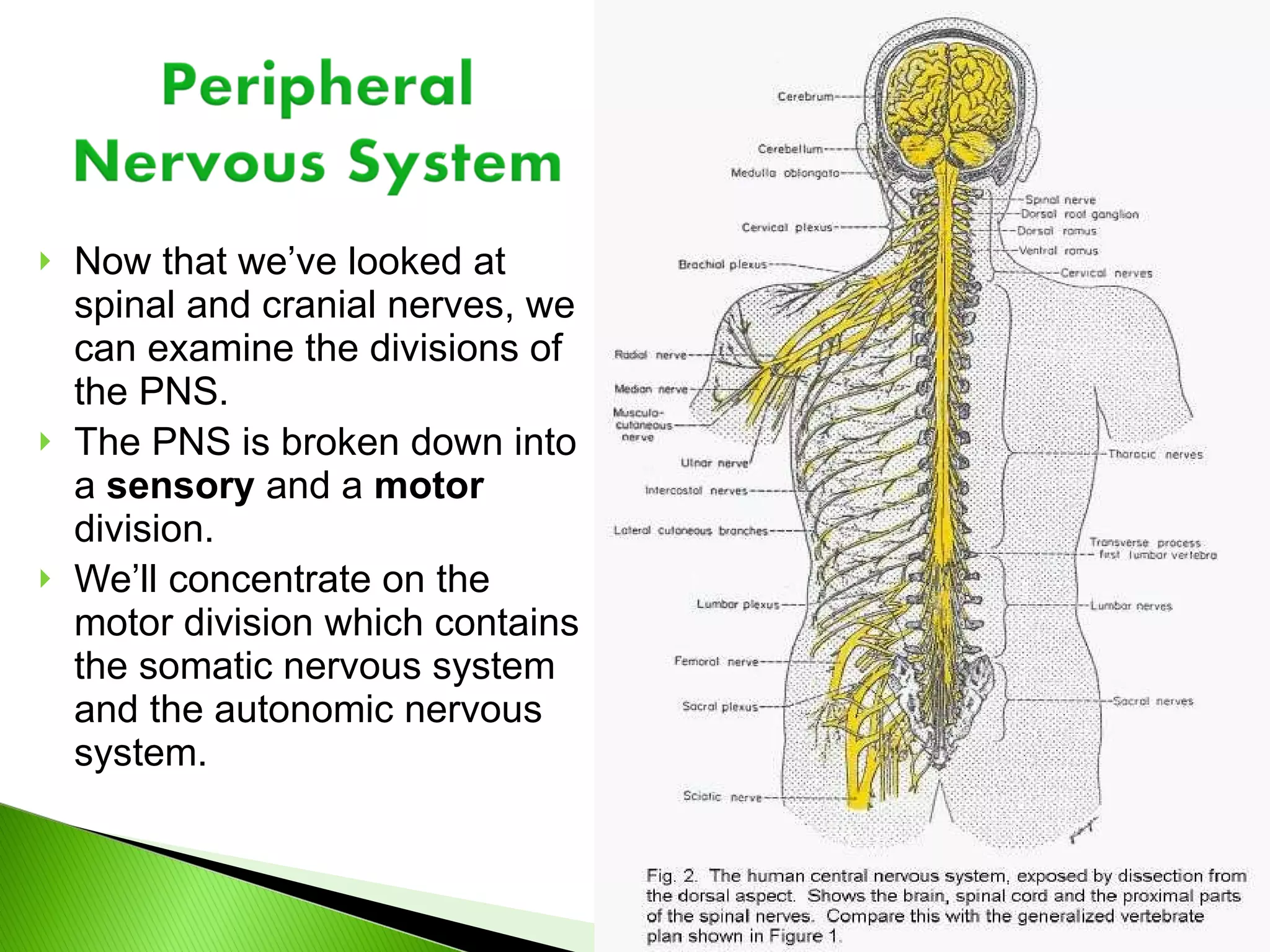 Now that we’velooked at spinal and cranial nerves, we can examine the divisions of the PNS. The PNS is broken down into a sensory and a motor division. We’ll concentrate on the motor division which contains the somatic nervous system and the autonomic nervous system.
