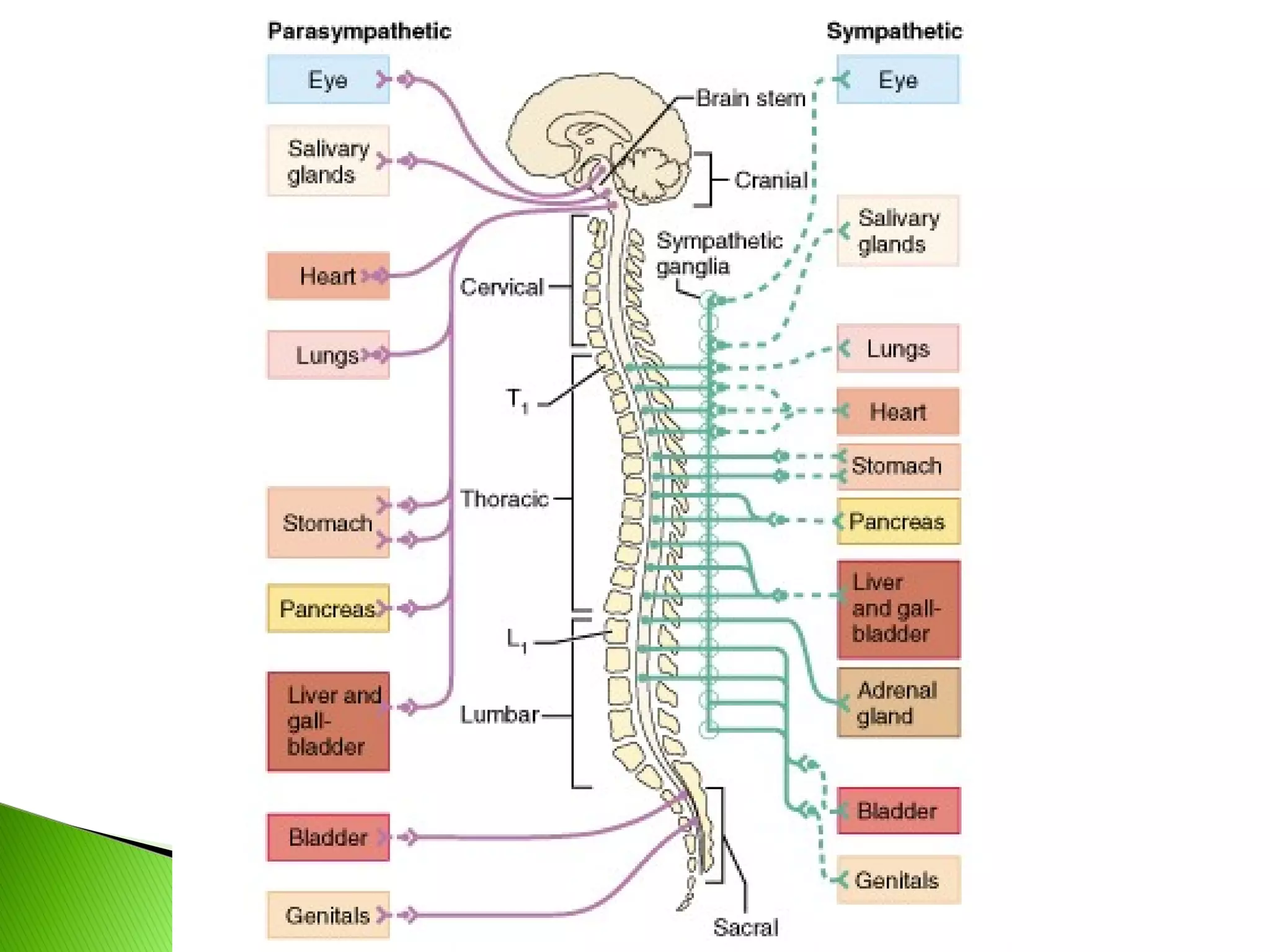 “ Restand digest ” system Calms body to conserve and maintain energy Lowers heartbeat, breathing rate, blood pressure CENTRAL NERVOUS SYSTEM Brain PARASYMPATHETIC Spinal cord Stimulates salivation Constricts bronchi Slows heartbeat Stimulates activity Contracts bladder Stimulates erection of sex organs Stimulates gallbladder Gallbladder Contracts pupil