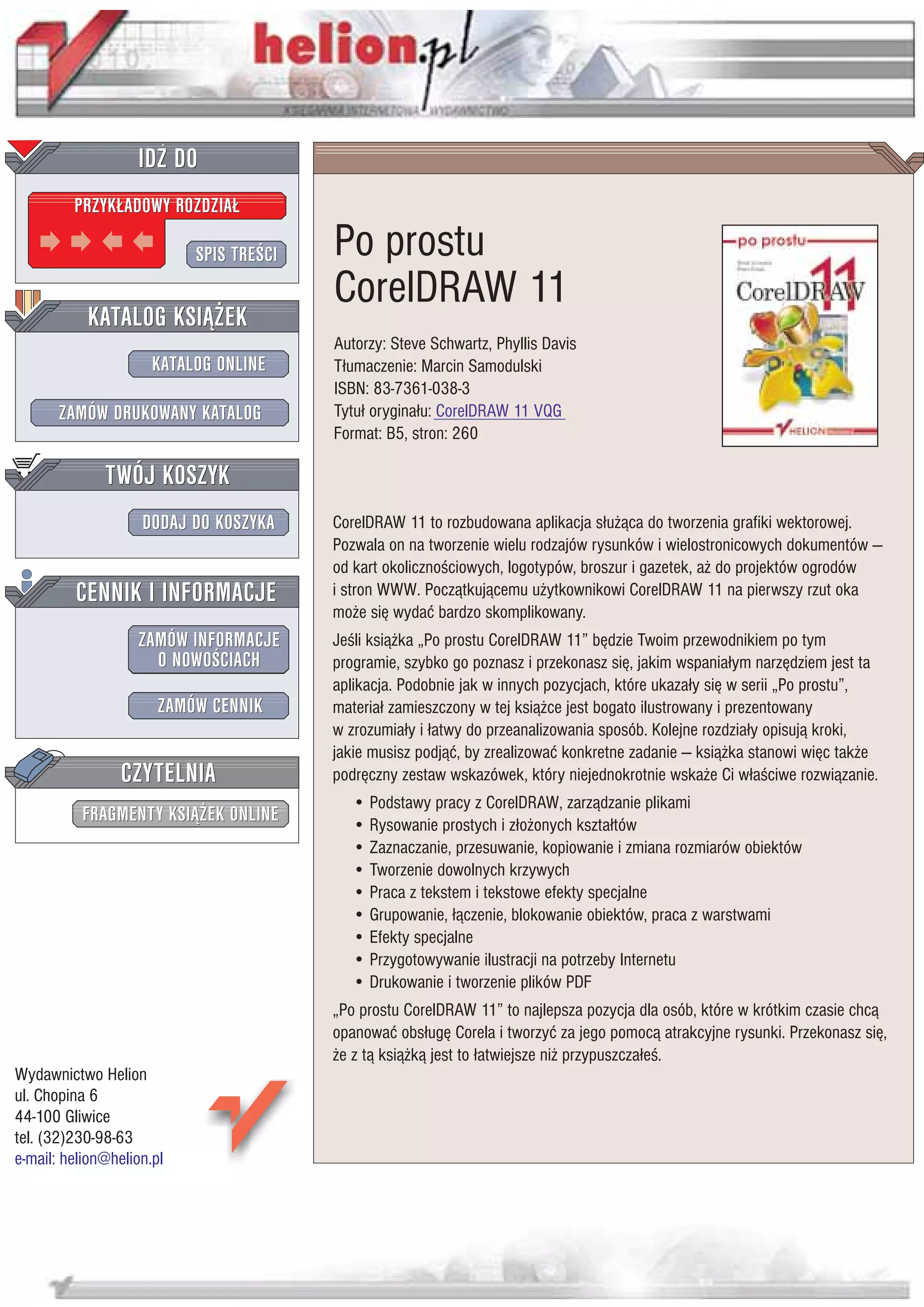 Jeśli książka "Po prostu CorelDRAW 11" będzie Twoim przewodnikiem po tym programie, szybko go poznasz i przekonasz się, jakim wspaniałym narzędziem jest ta aplikacja. Podobnie jak w innych pozycjach, które ukazały się w serii "Po prostu", materiał zamieszczony w tej książce jest bogato ilustrowany i prezentowany w zrozumiały i łatwy do przeanalizowania sposób. Kolejne rozdziały opisują kroki, jakie musisz podjąć, by zrealizować konkretne zadanie -- książka stanowi więc także podręczny zestaw wskazówek, który niejednokrotnie wskaże Ci właściwe rozwiązanie.