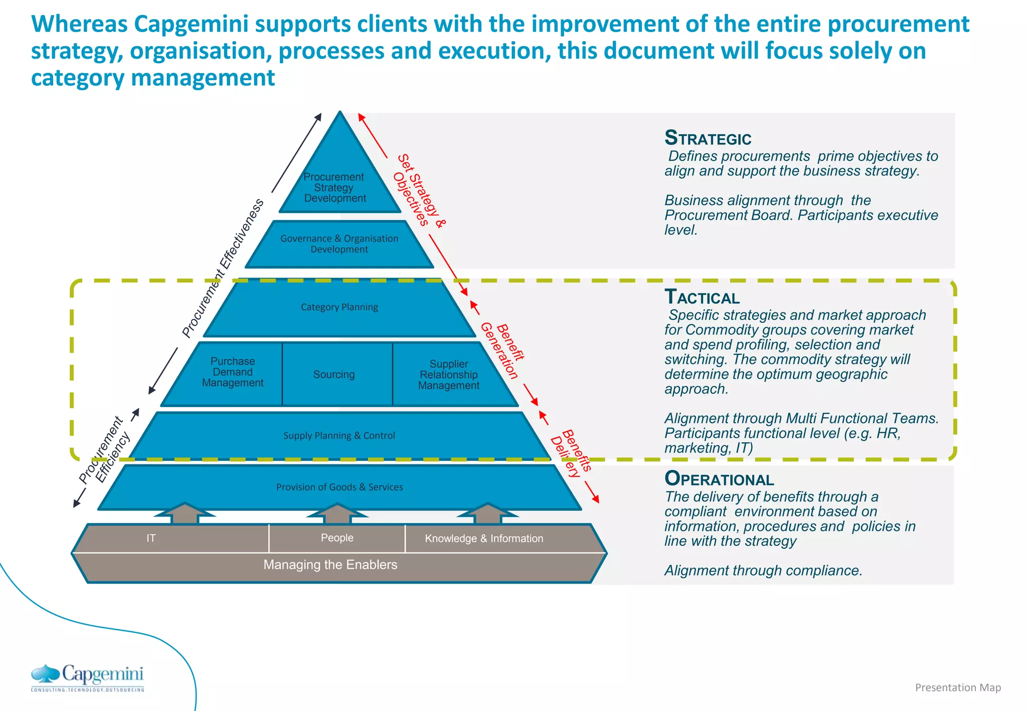 Category Management is Capgemini's approach to managing procurement categories. It aims to increase efficiency and realize cost savings. Key elements include end-to-end supply chain management, market awareness, technical knowledge, strong supplier relationship management, and understanding consumer needs. Capgemini provides strategic procurement, category support, and an on-demand procurement platform to help clients implement effective category management. Realizing savings and ensuring governance are top priorities in all category management initiatives.