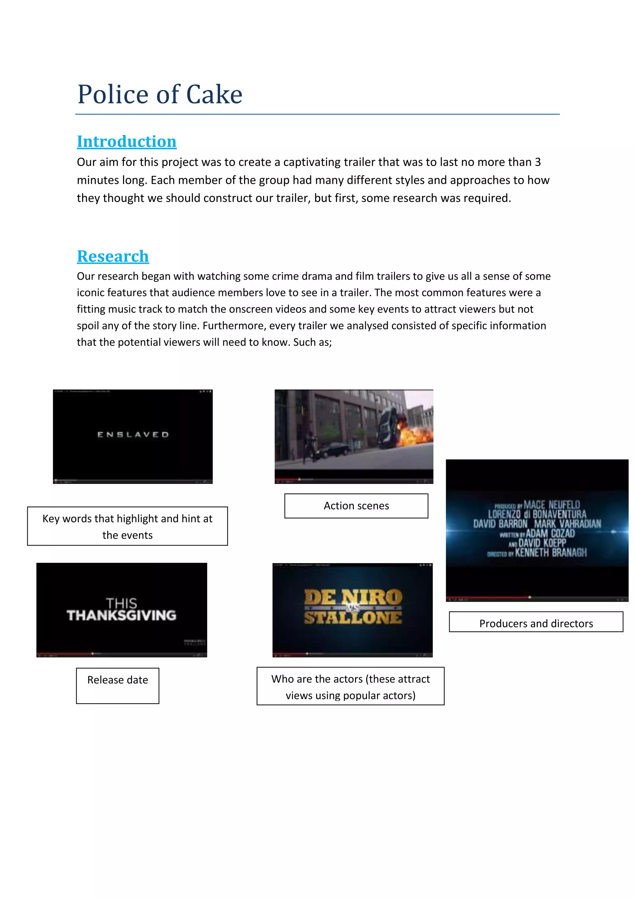 1. The document summarizes a group's project to create a 3-minute crime drama trailer. It describes their research process of watching crime drama trailers and episodes to identify common elements.