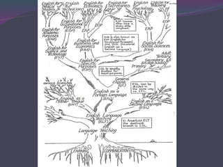 This document summarizes the origins and development of English for Specific Purposes (ESP). It discusses three key trends that contributed to the emergence of ESP: 1) increased demand for English as an international language after WWII, 2) advances in linguistic research, and 3) a focus on learner needs and interests. The document then outlines four phases in the development of ESP, from initial register analysis to skills-based and learning-centered approaches. It emphasizes that ESP is an approach rather than a defined product or methodology.