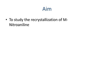 The document describes an experiment to recrystallize M-Nitroaniline. Recrystallization is a process where a solute is dissolved in a hot solvent and then allowed to crystallize as the solution cools. The procedure involves dissolving the M-Nitroaniline sample in a minimum volume of hot solvent, filtering any insoluble impurities, slowly cooling the solution to induce crystallization, recovering the crystals through vacuum filtration, washing with cold solvent, and allowing the crystals to dry before determining melting point. The result was that M-Nitroaniline was successfully recrystallized with a melting point of 120°C.