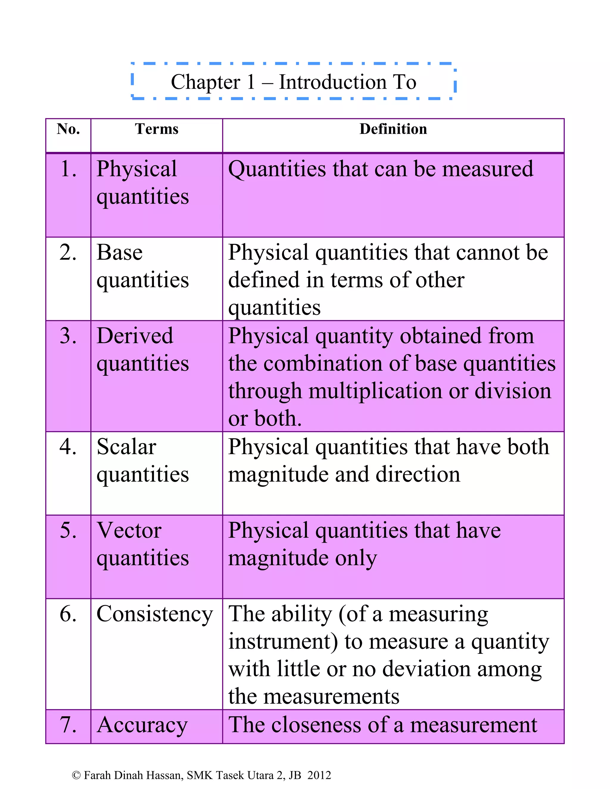 This document defines various physics terms across multiple chapters. It provides definitions for over 100 terms related to physical quantities, force and motion, heat, light, waves, electricity, electromagnetism, and electronics. The terms are organized into tables with their number, term, and definition.