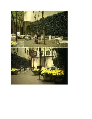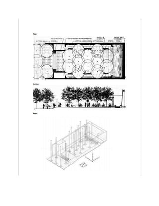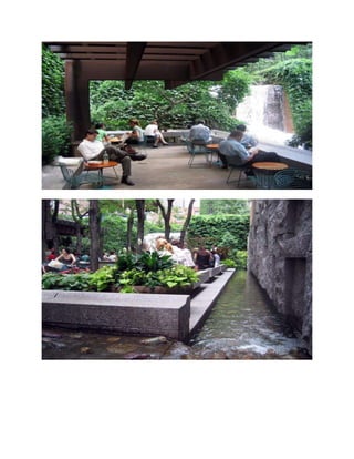 The document provides information on several local and international pocket parks. It describes Standard Chartered Park in Kuala Lumpur, Malaysia, which was refurbished in 2012. It is located along major roads in the city center and features landscaping for relaxation and events. GreenAcre Park in New York City opened in 1970 and occupies 6000 square feet, providing relaxation space between office buildings. Paley Park in New York is celebrated as one of the smallest urban parks, containing a small waterfall that blocks out street noise. It is a popular lunch spot. The document also describes Jonker Walk World Heritage Park in Malacca, Malaysia, the TPO Friendship Park in Penang, Malaysia, and provides characteristics