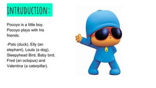 Pocoyo is a cheerful little boy who enjoys outdoor play with his friends, including Pato the duck, Elly the elephant, Loula the dog, and others. Each character has distinct traits, such as Elly's strength and Pato's grouchiness. The document outlines the friendships and adventures shared among these colorful characters.