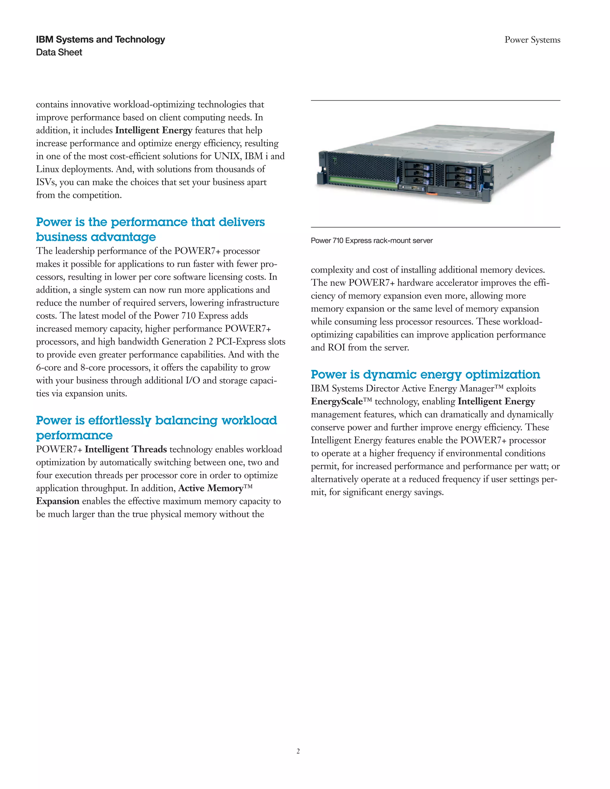 The IBM Power 710 Express server is a high-performance, energy-efficient, and compact server built on Power7+ processor technology, designed to manage complex business transactions and mobile workloads. It features innovative workload optimization, intelligent energy management, and robust security capabilities that enhance performance and reduce operational costs. With a flexible architecture, it supports various operating systems and virtualization technologies, enabling scalability and increased application availability.