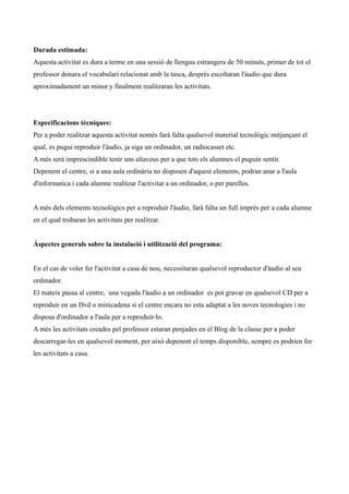 ·L'eix principal de l'activitat és l'àudio, per reproduir-lo a l'aula sera necesari un ordinador (a l'aula