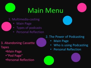 1. The document discusses the use of podcasting in higher education, including uploading lectures online for students to access remotely and expanding to video and iPods to make it more accessible. 2. It provides examples of schools using podcasting, including a Spanish teacher whose students became more engaged and Purdue University replacing cassette tapes with podcasts of lectures. 3. Benefits mentioned are students being able to rewatch lectures, watch missed classes, and have lectures accessible anywhere through portable devices.