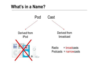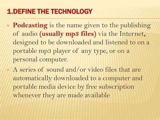 This document discusses podcasting and its use in distance education. It begins by defining podcasting as the publishing of audio files, typically MP3s, on the internet for download to portable devices. It notes podcasting can supplement lecture materials and accommodate different learning styles. The document outlines features like automatic downloading and mobile access. It explores how podcasting supports learning by making education student-centered and drawing students to the technology. It also discusses concerns for students and teachers regarding access, learning objectives, and copyright issues. Examples of universities using podcasting are provided.