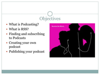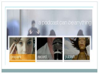 This document provides an overview of podcasting including definitions, how to find and create podcasts, necessary equipment and software, the publishing process, and strategies for educational integration. Key points include: