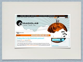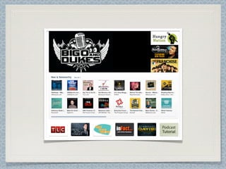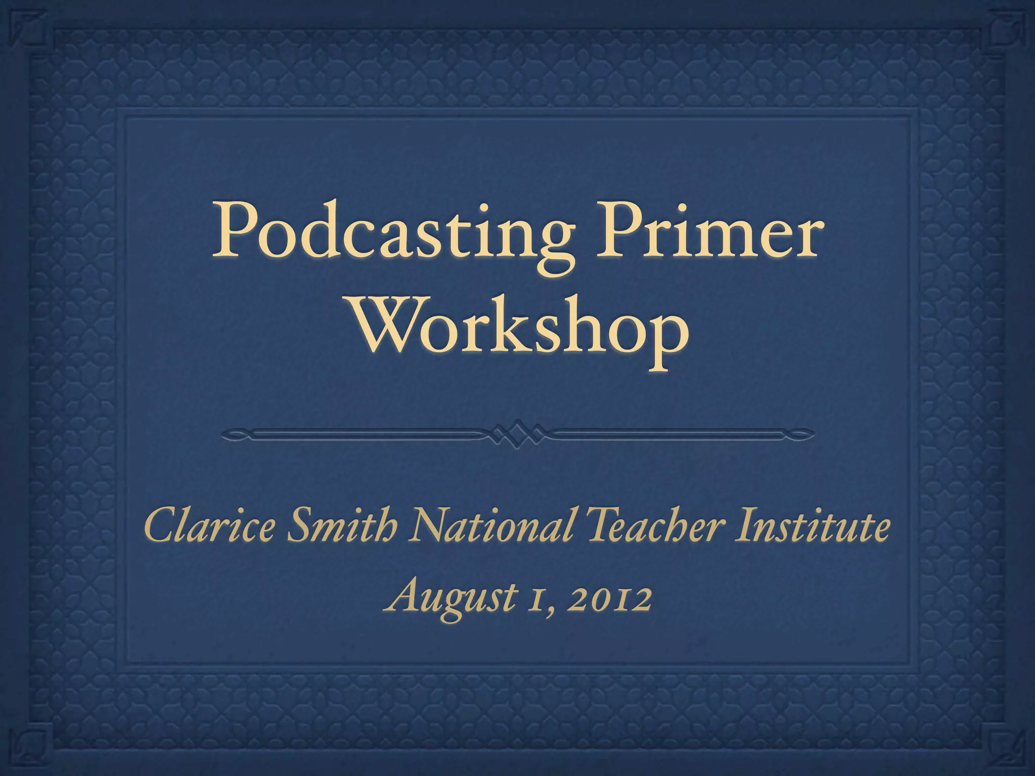 This document provides information about a podcasting workshop held at the Clarice Smith National Teacher Institute. The workshop taught participants how to create 2-3 minute podcasts about selected artworks using either Audacity or VoiceThread. Participants learned recording techniques using the Voice Memos app and transferring recordings to iTunes before importing into Audacity for editing. They also learned how to use VoiceThread to marry audio recordings with images. The workshop was led by three presenters with experience using these tools in museum and educational settings. An optional advanced tutorial provided additional instruction on using Audacity and an introduction to Prezi.