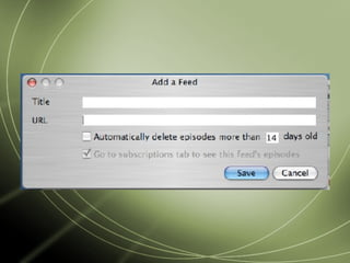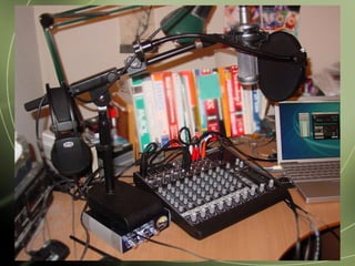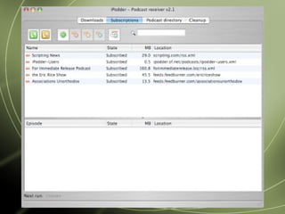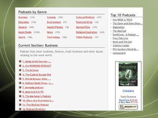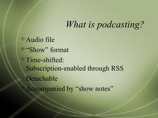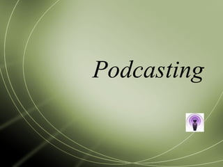 Podcasting involves distributing audio files that users can subscribe to and listen to at their convenience. It emerged in 2004 and has grown significantly, with over 100,000 podcasts now available. Podcasts allow users to listen to audio content on their own schedule, from any location. They can be produced with minimal equipment and are used by both individuals and businesses to distribute content on various topics.