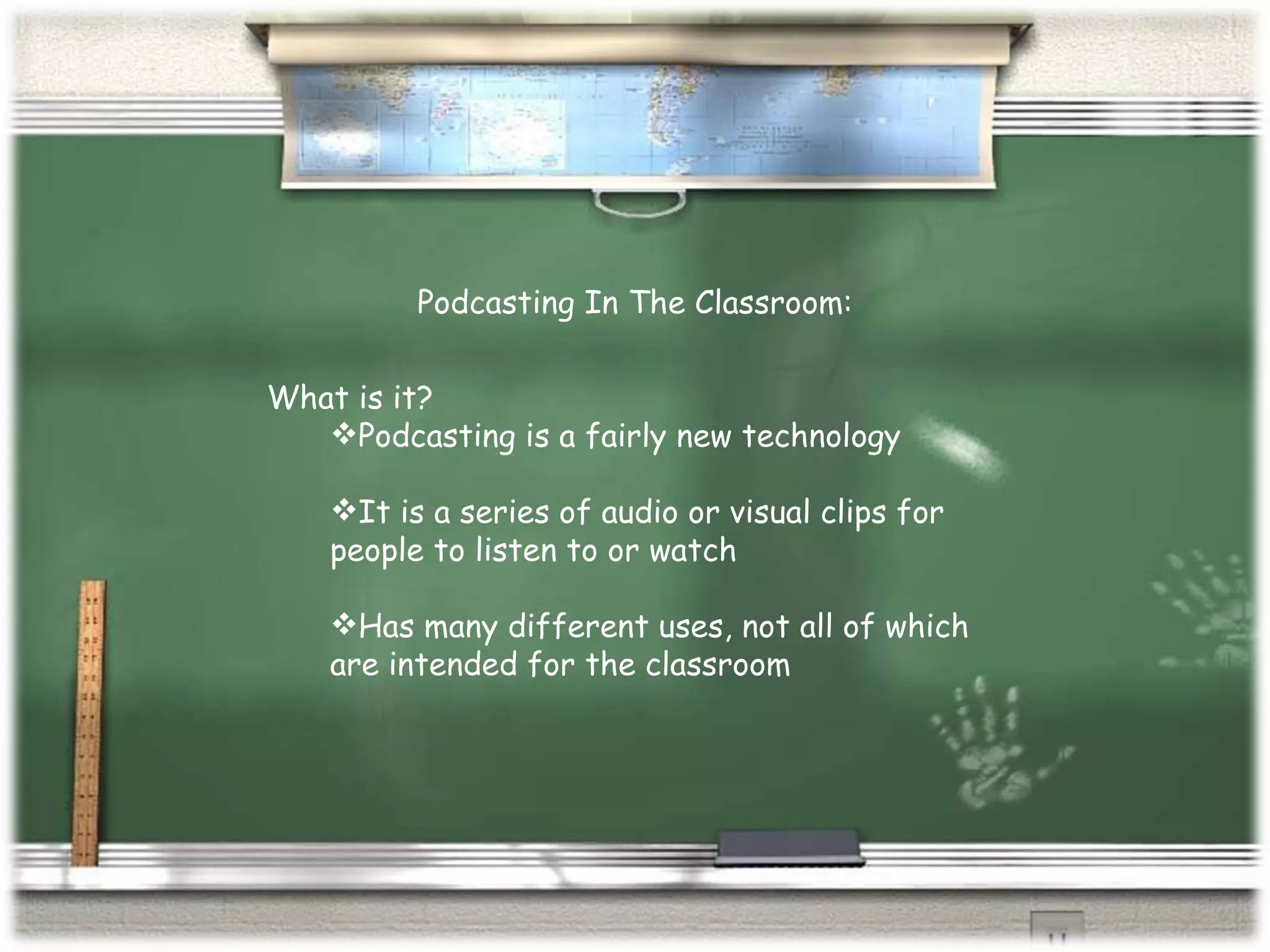 Podcasting allows students to record and listen to lesson plans, and make their own podcasts to help themselves and classmates learn. Creating podcasts takes about 3-4 weeks to learn but allows students to brainstorm, practice recordings, and upload and share their work. Podcasting benefits students by providing audio lessons they can access anywhere for studying. It also engages parents and provides creative ways for students to learn while accommodating different learning styles.