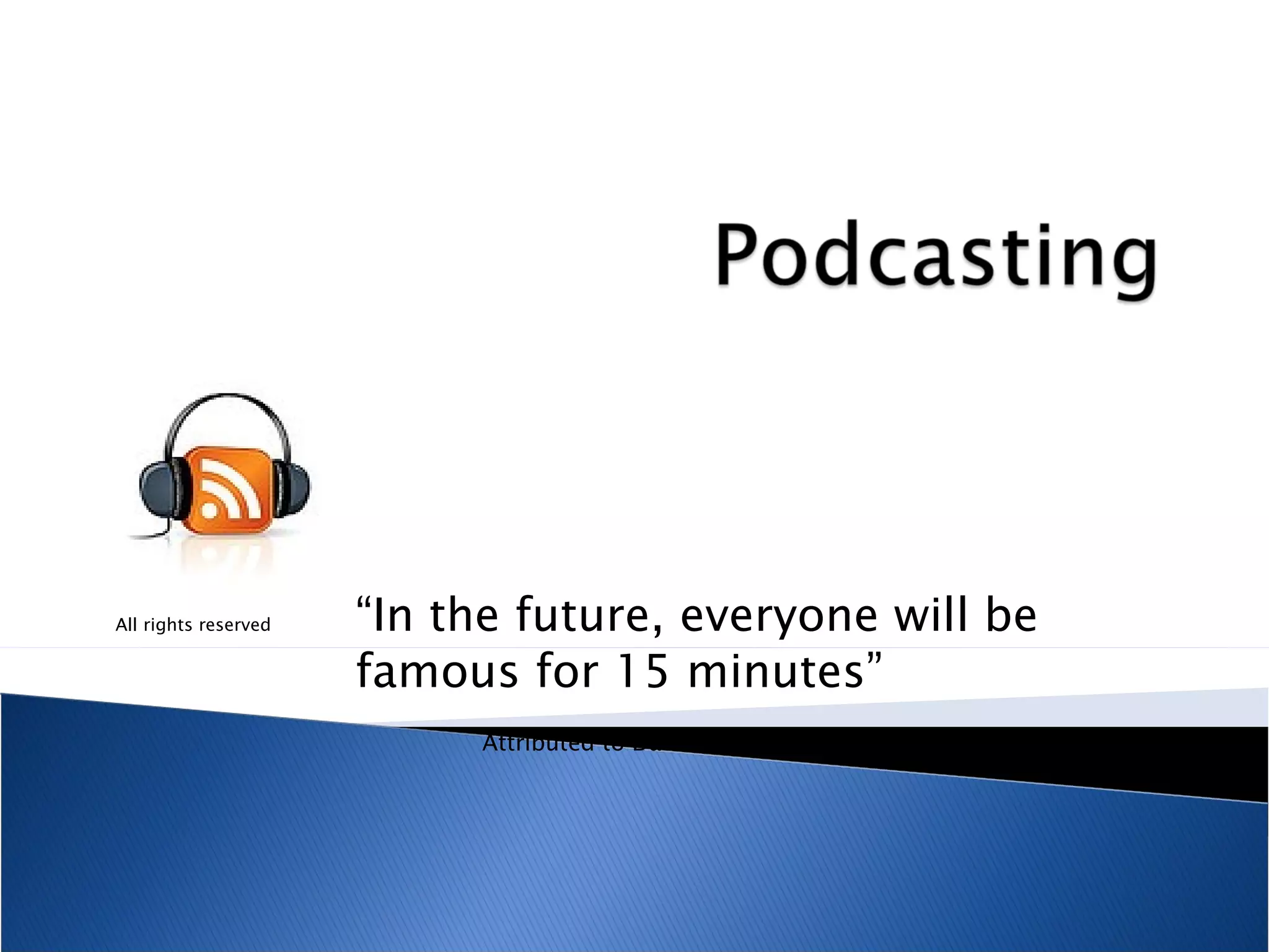 Podcasting involves creating and distributing audio files through an RSS feed. Users can subscribe to podcasts on various topics and have new episodes automatically downloaded to their devices. Creating podcasts allows teachers to effectively communicate with students and parents about classroom activities, distribute homework and recordings, and engage students in learning. All that is needed to create podcasts is a microphone, audio editing software, and a website to post and distribute recordings through an RSS feed.