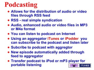 The document discusses the benefits and processes of podcasting as an educational tool, highlighting its role in developing core literacy skills and facilitating learning across various disciplines. It includes detailed instructions on how to create, edit, and publish podcasts, along with resources for finding and consuming podcasts. Additionally, it features sample podcast links that demonstrate effective use within educational contexts.