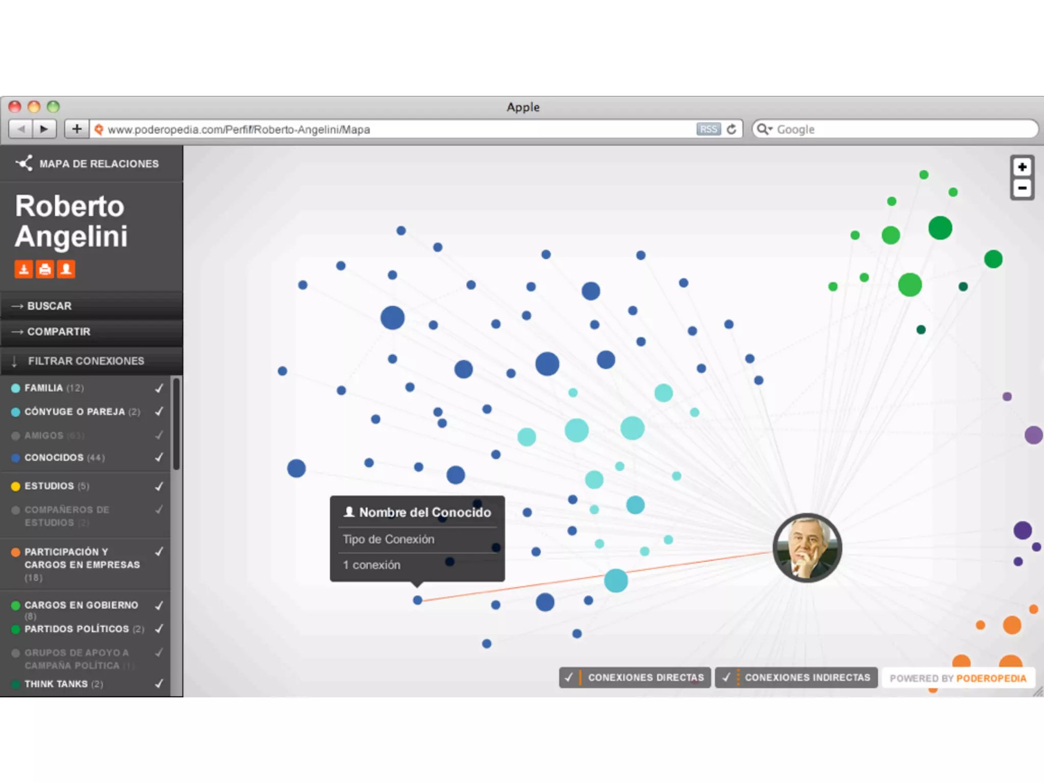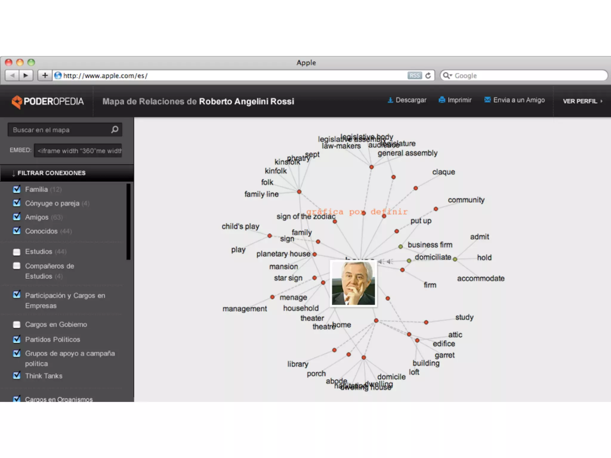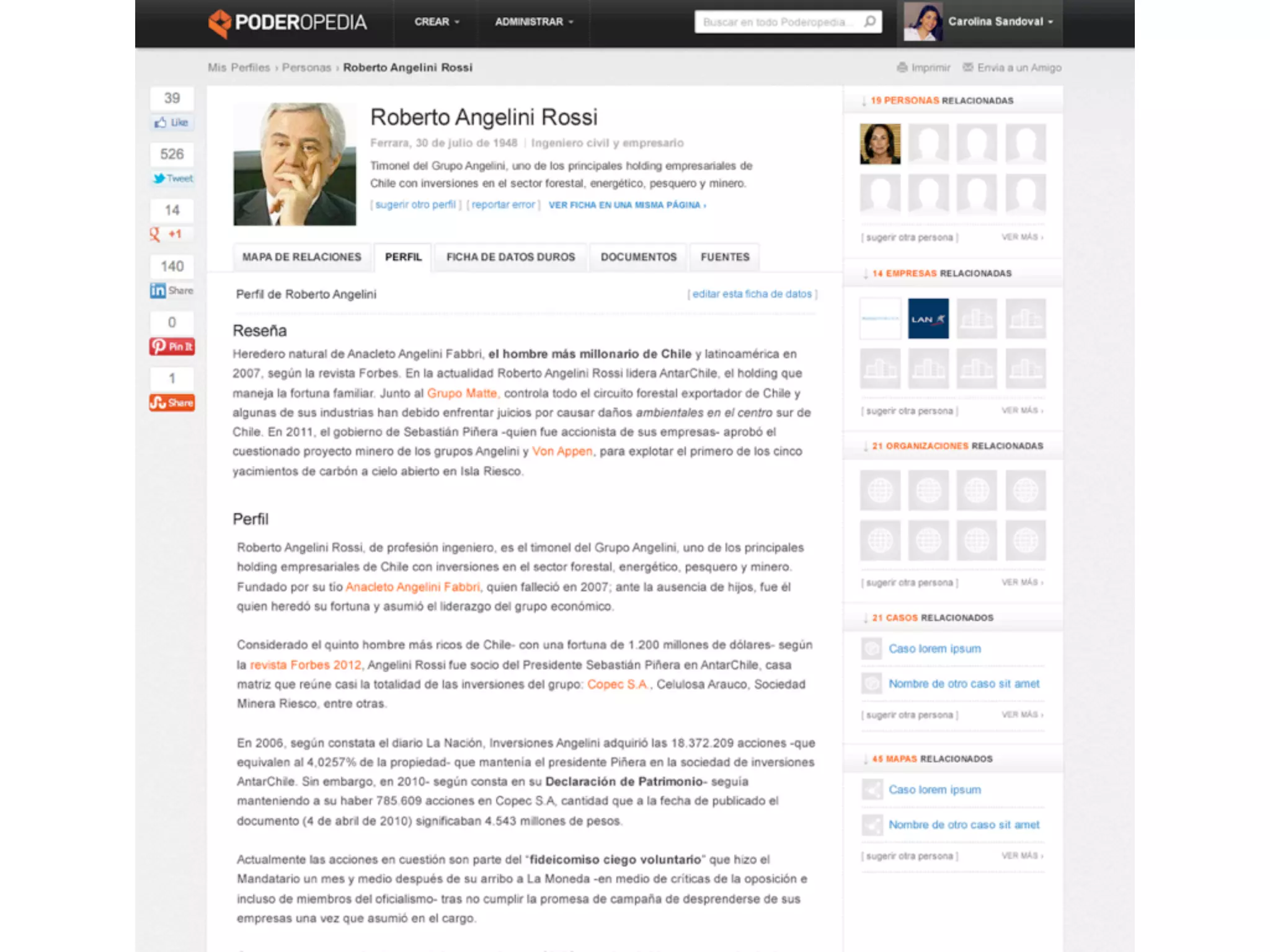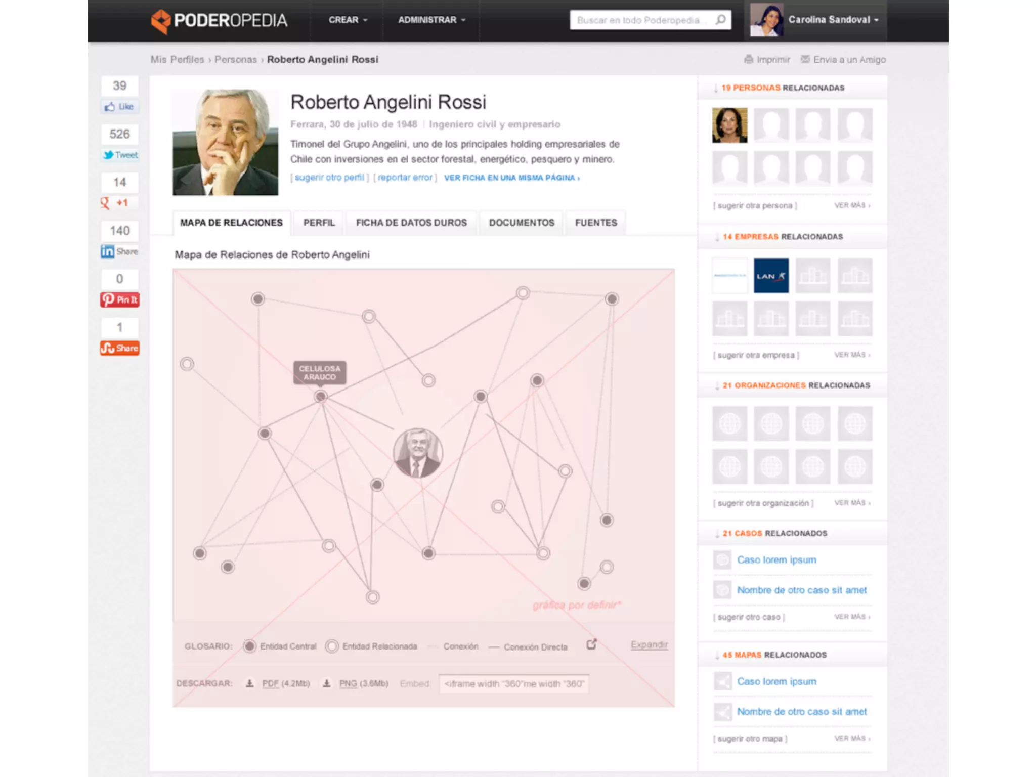 This document outlines a data journalism project called Poderopedia that aims to map the connections between Chile's political and business elite. It details how Poderopedia collects information from public and crowdsourced sources, constructs profiles of individuals that include relationship maps and sources, and visualizes the connections between people, organizations, and companies to increase transparency around who wields power and influence in Chile. The project uses techniques like scraping, custom ontologies, linked data, and triple stores to combine editorial content and hard data about the people and institutions that comprise Chile's "one percent."