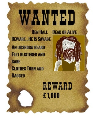 Ben Hall is wanted dead or alive for a reward of £1,000. His appearance is described as having an unshorn beard, blistered and bare feet, and torn and ragged clothes, indicating he is living rough in the bush. He is also described as savage, highlighting the danger he poses if found.
