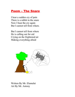 A poem describes hearing the cries of a rabbit caught in a snare, unable to locate where the cries are coming from. The rabbit calls for help, its cries filling the air and spreading fear, as it remains trapped in the unseen snare. The poem was written by Mr. Elumalai and illustrated by Mr. Antony.