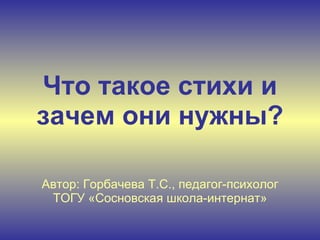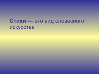 Документ обсуждает стихи как вид словесного искусства и их роль. В нём упоминаются различные жанры стихотворений, такие как элегии, эпиграммы и оды, а также приведены примеры. Также содержится задание для определения жанра стихотворения по рисунку и список информационных ресурсов.
