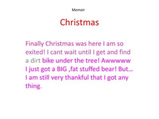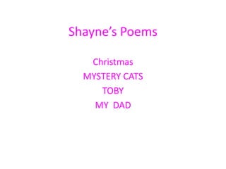This collection of poems and memoirs by Shayne describes various experiences. The first poem talks about excitement for Christmas and receiving gifts. The second captures trying to find mystery kittens. The third celebrates a close friendship with a classmate named Toby. The final memoir reflects on fond memories and time spent with the author's father before his death.