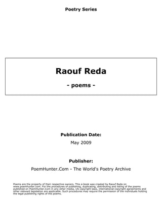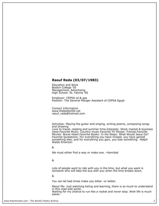 This document provides biographical information about the poet Raouf Reda and includes several of his poems. It lists his education, employment, contact information, interests and activities. It then presents 9 poems he has written on various topics like love, heartbreak, friendship and blessings. The poems range in length from 2 to 6 stanzas.