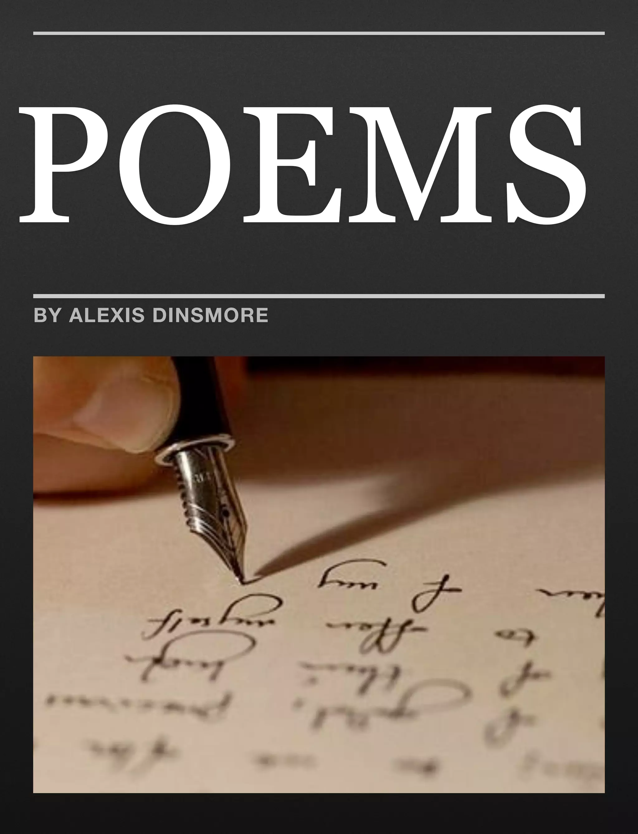 This document contains a collection of poems by Alexis Dinsmore along with definitions and examples of different poetic devices and forms. It discusses poetic terms like speaker, diction, imagery, allusion, simile, personification, metaphor, and more. It also provides examples of different types of poems including haiku, "I Am" poems, sonnets, concrete poems, acrostic poems, free verse, odes, and parodies.