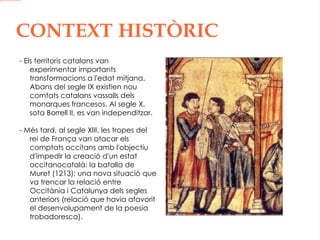 CONTEXT HISTÒRIC - Els territoris catalans van experimentar importants transformacions a l'edat mitjana. Abans del segle IX existien nou comtats catalans vassalls dels monarques francesos. Al segle X, sota Borrell II, es van independitzar. - Més tard, al segle XIII, les tropes del rei de França van atacar els comptats occitans amb l'objectiu d'impedir la creació d'un estat occitanocatalà: la batalla de Muret (1213); una nova situació que va trencar la relació entre Occitània i Catalunya dels segles anteriors (relació que havia afavorit el desenvolupament de la poesia trobadoresca).