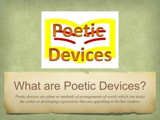 This document discusses poetic devices and provides examples of their use in songs. It defines poetic devices as methods of arranging words to make expressions appealing to readers. Some devices discussed include metaphor, simile, imagery, repetition, onomatopoeia, personification, and alliteration. Examples are given of specific songs that utilize these devices, such as "Price Tag" using onomatopoeia and "California Gurls" using alliteration. The document aims to explain how poetic devices can enhance meaning and help convey the main ideas in songs.