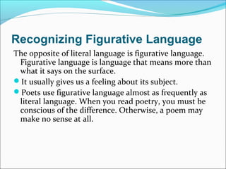 The document discusses different types of figurative language including simile, metaphor, personification, hyperbole, idioms, imagery, alliteration and onomatopoeia. It provides examples for each type and a short description of what each figurative language technique means. It also includes a quiz with sentences to identify the figurative language being used. Finally, it lists some lesson plan and resource links for teaching these different figurative language techniques.