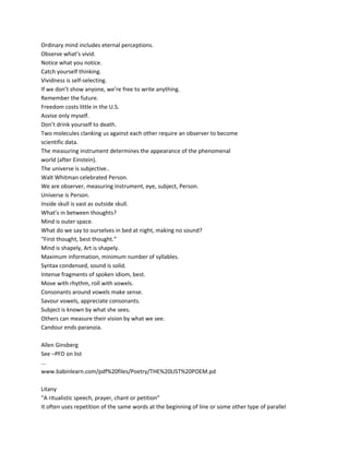The document provides information about different poetic forms that students will explore in class, including list poems, litanies, haiku, pantoums, and dramatic monologues. It includes objectives such as learning the purpose of forms, writing forms to find the best fit for their purpose, and discussing how dramatic monologues can be used. Examples of different forms are provided, such as a list poem by Allen Ginsberg and a pantoum by John Ashbery. Homework involves choosing a form to write and composing a dramatic monologue.