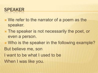 This document defines and provides examples of key poetic terms and elements including: speaker, lines and stanzas, rhyme and rhyme schemes, sound devices like alliteration and assonance, poetic techniques like onomatopoeia, personification, and imagery, and types of poetry such as narrative, lyric, and dramatic. It aims to familiarize the reader with the basic building blocks used in poetry.
