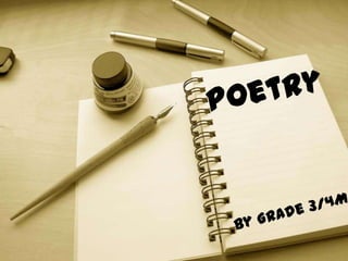 This document provides examples of different types of poetry that students in grade 3/4M have been learning about, including acrostic poems, alliteration, W poems, you poems, cinquain poems, and haiku poems. Examples of each type of poem are presented along with the students' names.