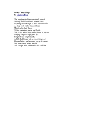 This poem describes a simple village life where children play and laugh while their mothers cook, men tend to farms, and elders warm in the sun, singing of past days. The village lives simply and fulfills needs without greed, with human and animals living as one with nature as intended, in a place that is pure, untouched, and carefree.