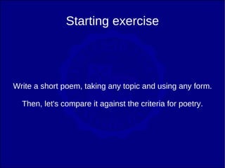 This document discusses what poetry is and its key elements. It begins with an exercise for writing a poem and comparing it to criteria for poetry. Some of the main criteria discussed include the function of poetry to entertain and instruct, the importance of universal and enduring content, and using metaphor and ambiguity to suggest deeper meanings. The document also covers various poetic forms and techniques like rhythm, rhyme, imagery, and themes. Overall, it provides guidance on analyzing and understanding poetry from both a basic and deeper level.